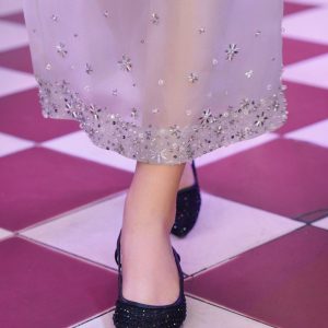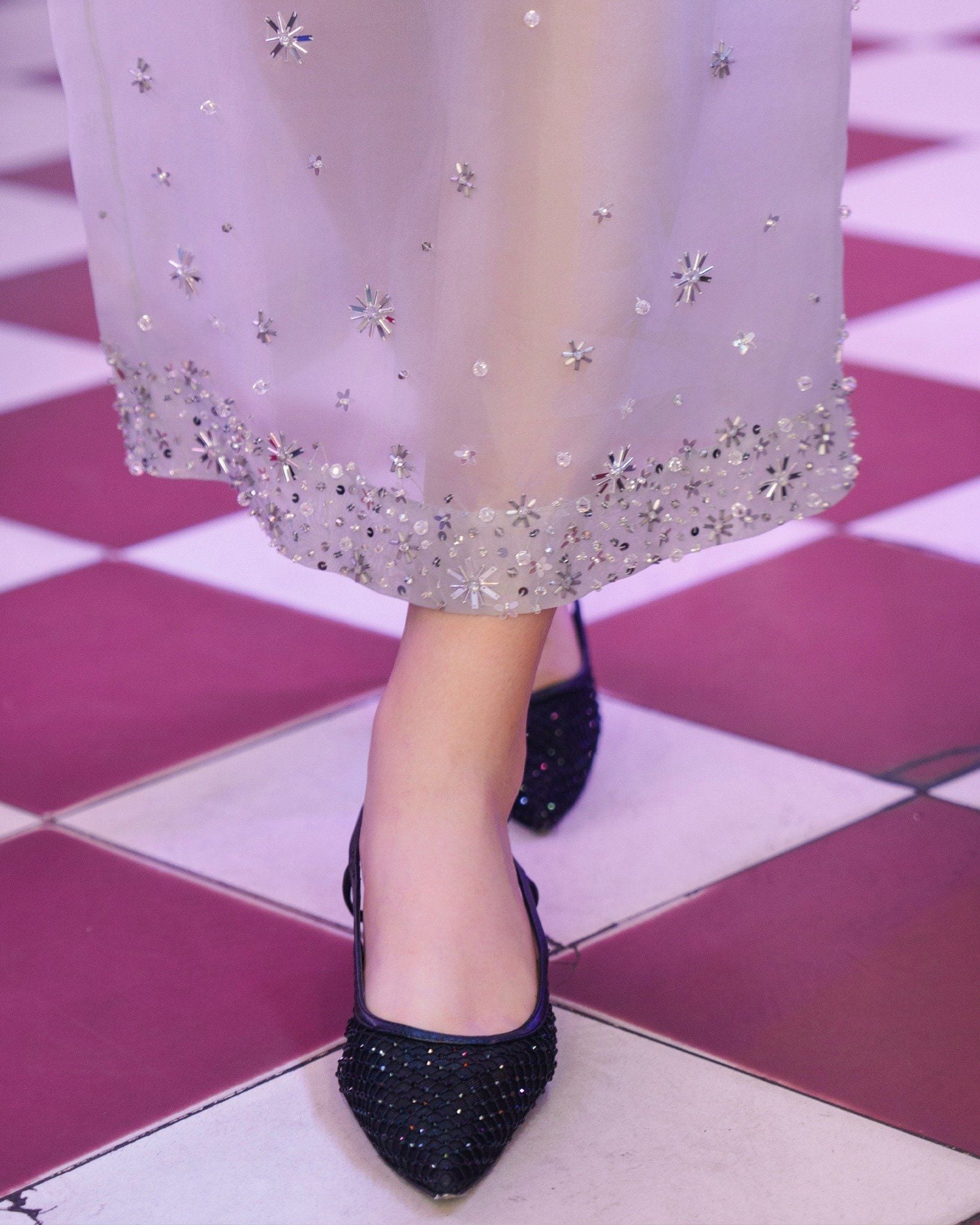 Điểm đắt giá nhất của sản phẩm chính là lớp voan mỏng (Organza) xuyên thấu ở phần chân váy. Những viên đá được đính kết thủ công một cách nhẹ nhàng, tạo độ bắt sáng lung linh theo mỗi bước chân của bạn. Màu sắc Smoky and Light Grey (Xám khói) mang đến vẻ đẹp huyền bí, sang trọng, cực kỳ phù hợp cho các buổi tiệc tối hoặc sự kiện quan trọng.